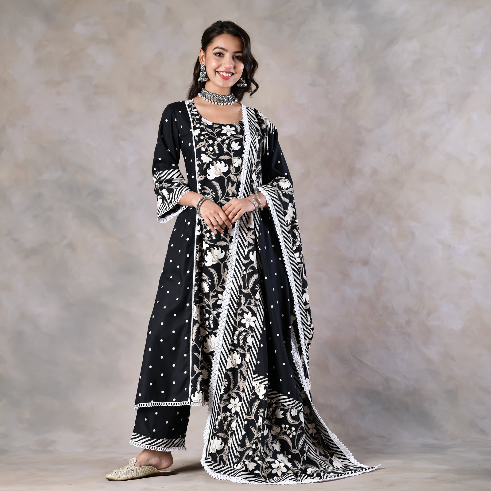 Black Floral Paneled Kurta Pant and Dupatta Set