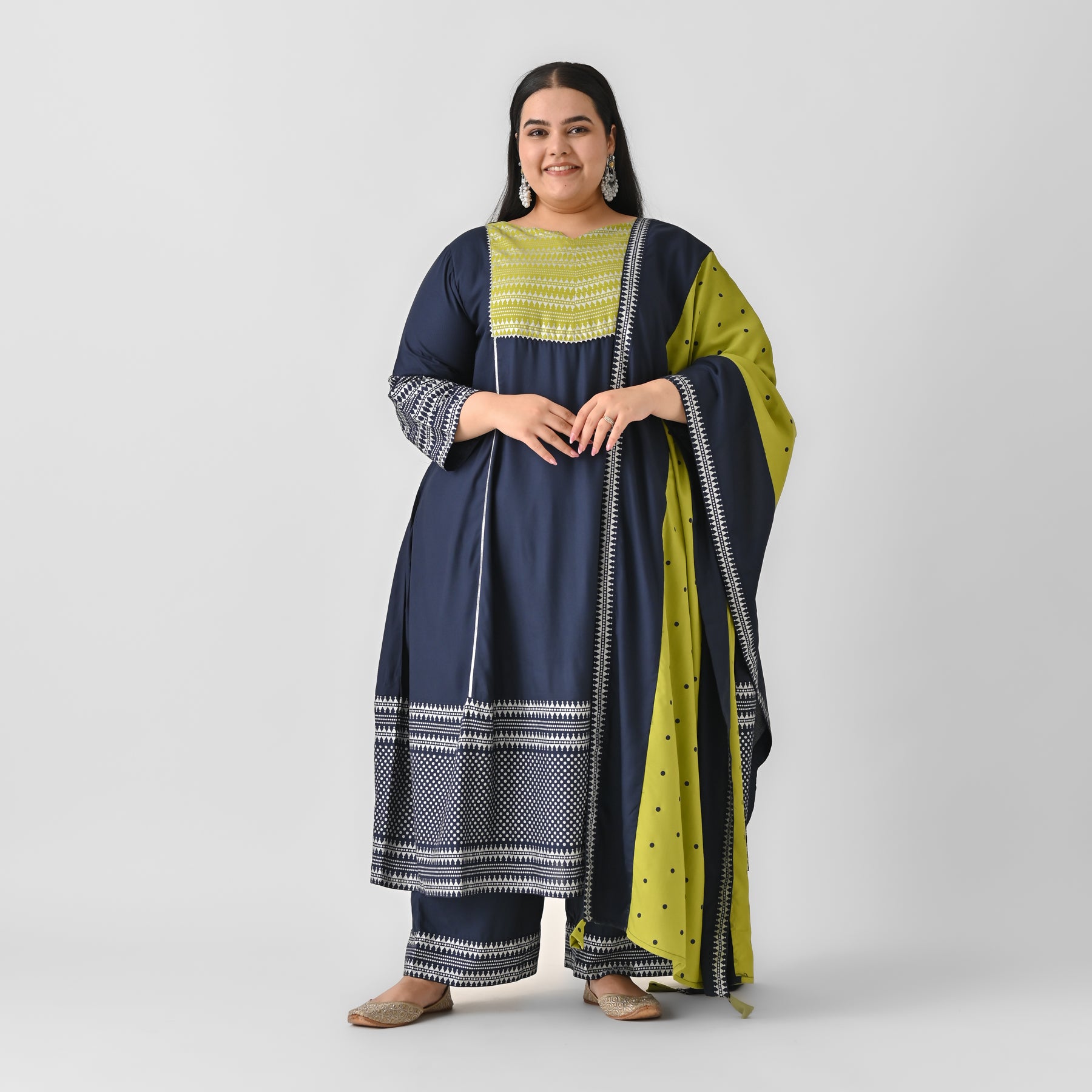 Blue & Olive Silver Printed Flared Kurta Dupatta Set with Gota Details – SOM