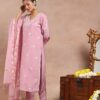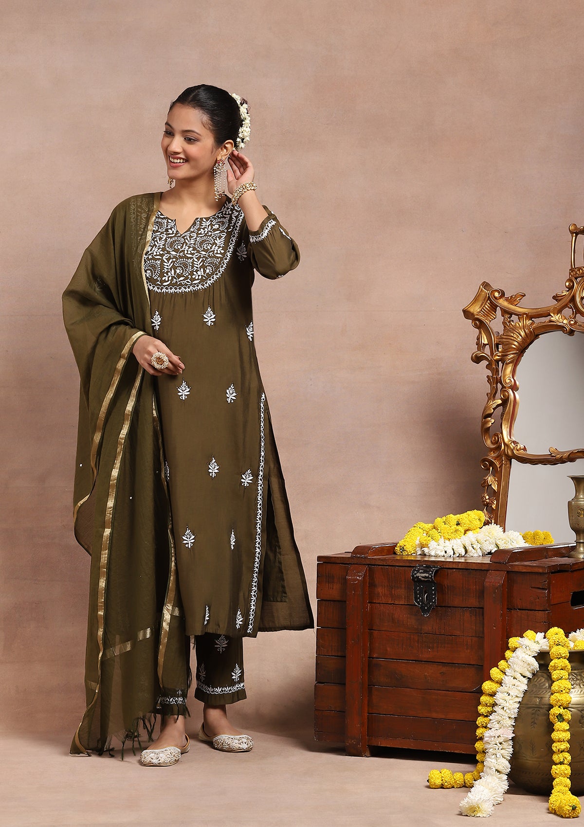 Chanderi Mukaish Solid Women’s 4 PC Long Kurta Set – Olive Green