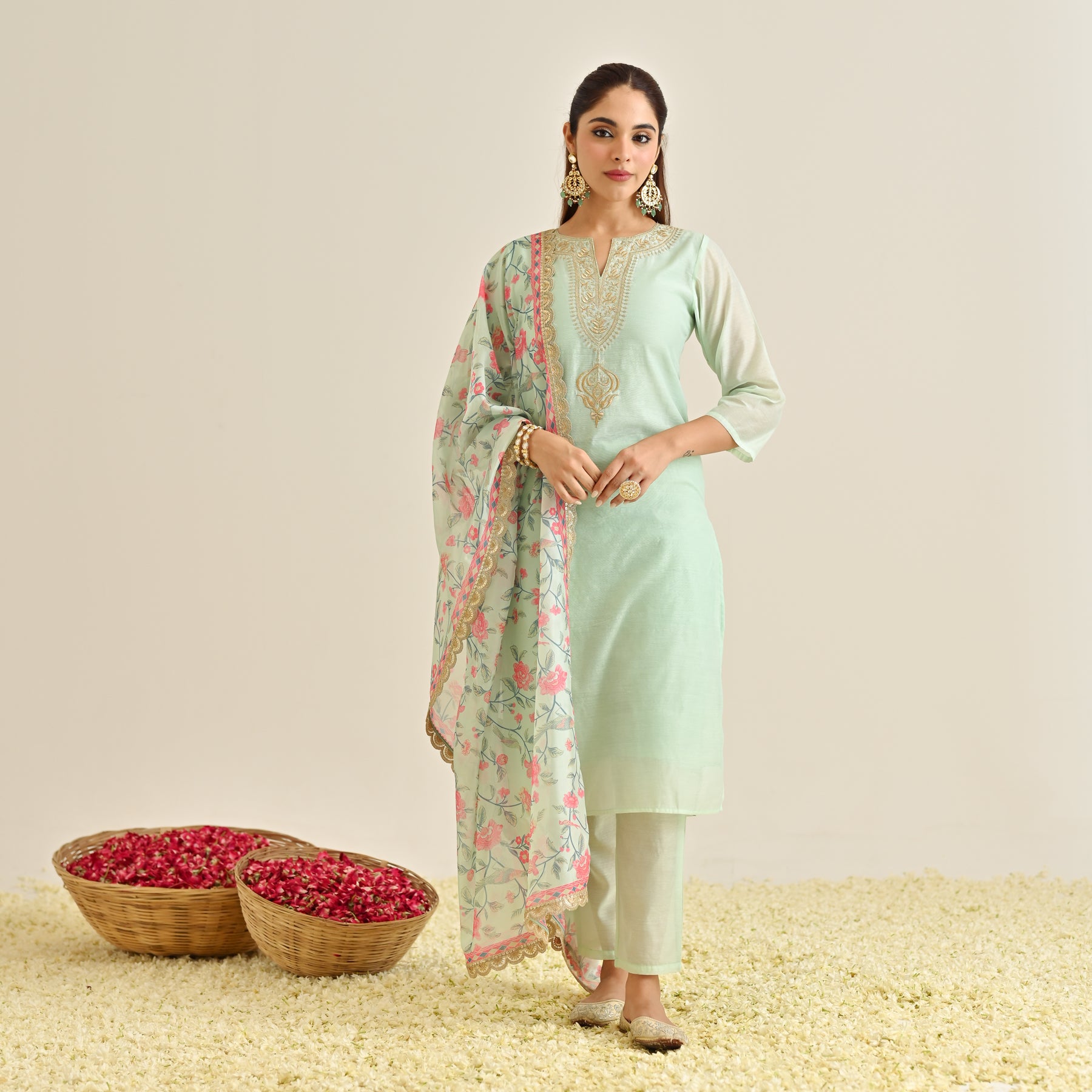 Mint Straight Festive Kurta Set with Printed Dupatta & Yoke Detail