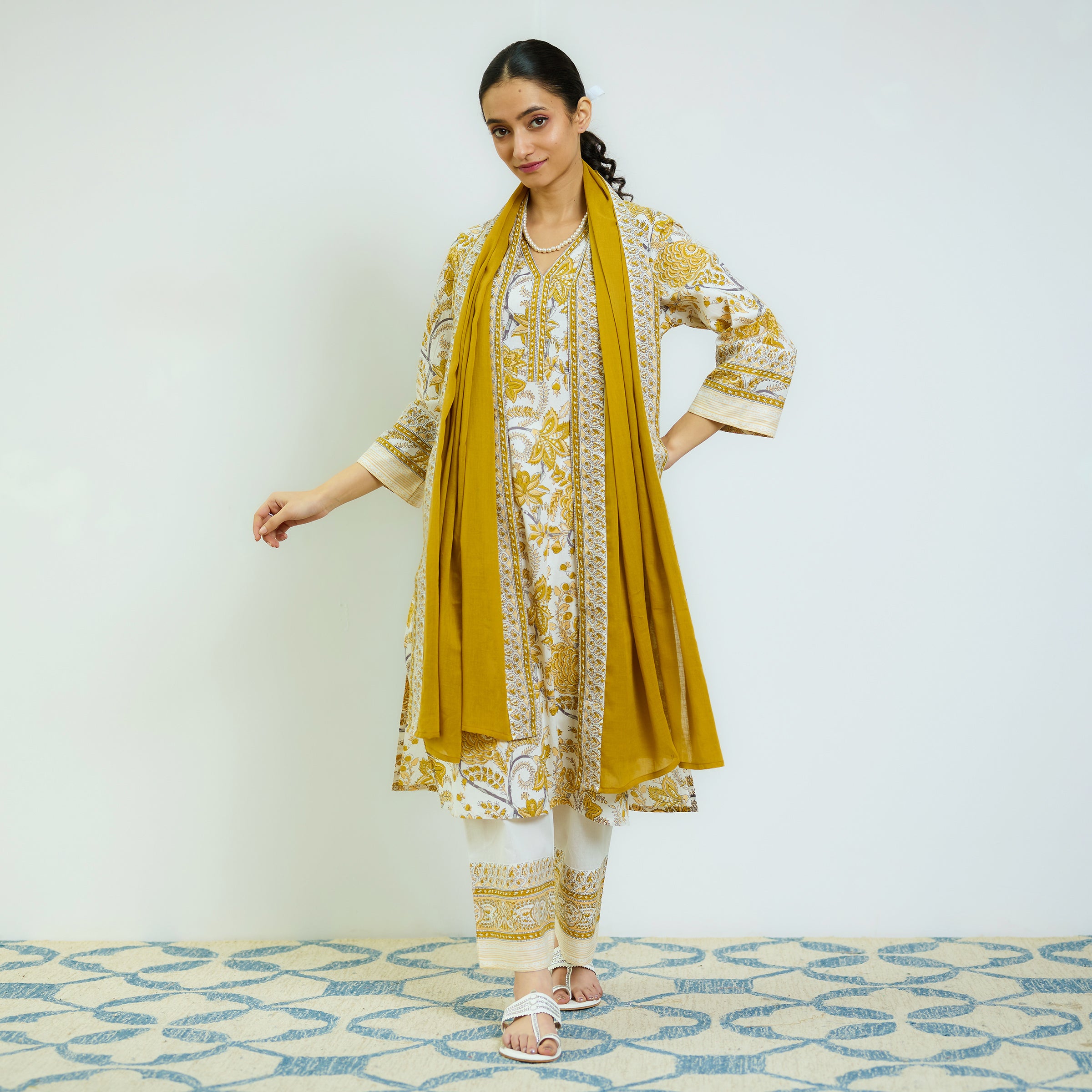 Ochre Yellow Sanganeri Printed Cotton Kurta Set with Contrast Mul Cotton Dupatta