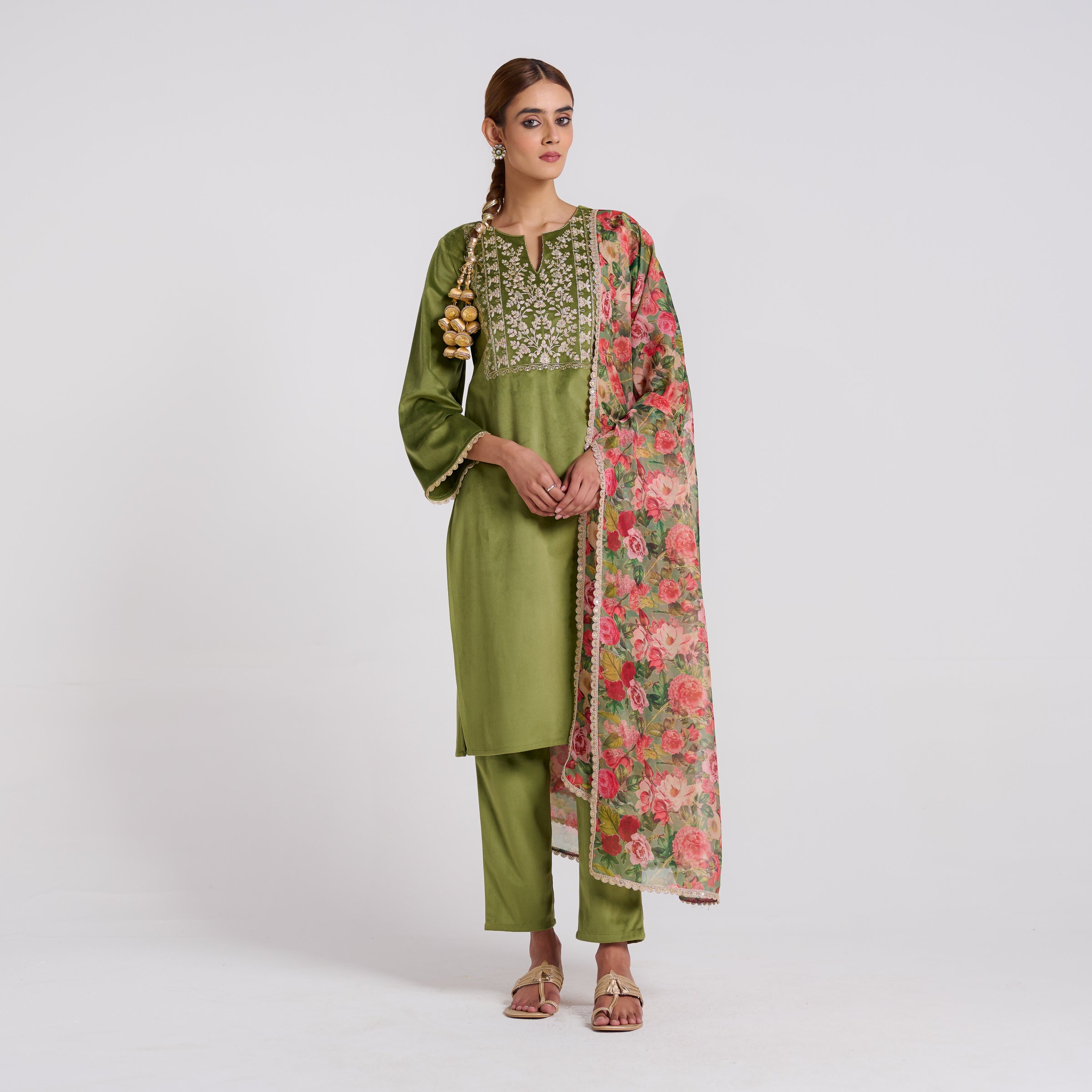 Olive Embroidered Phulwari Velvet Set with Dupatta