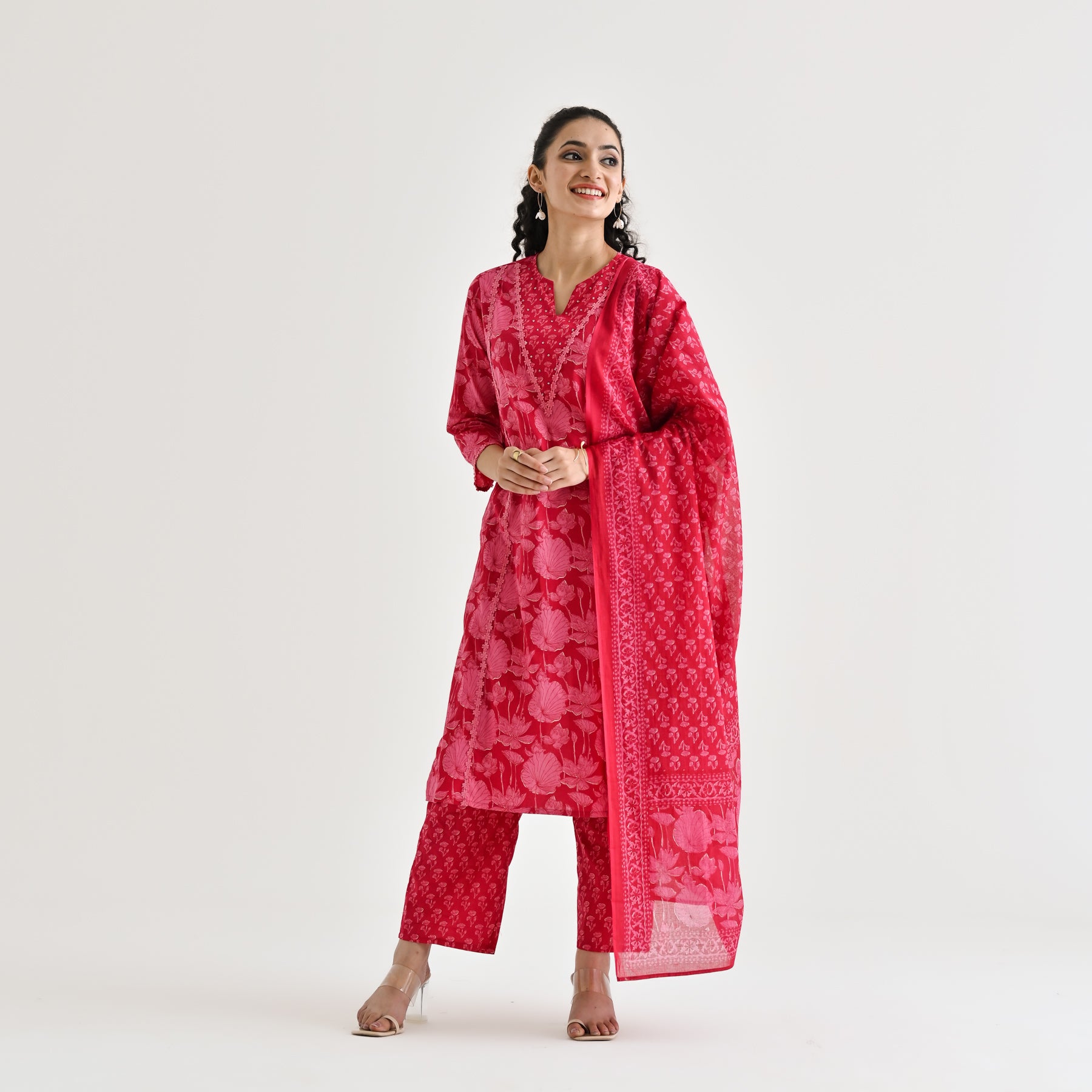 Pink Lotus Printed Cotton Kurta Pant Dupatta Set with Lace & Embroidery Details